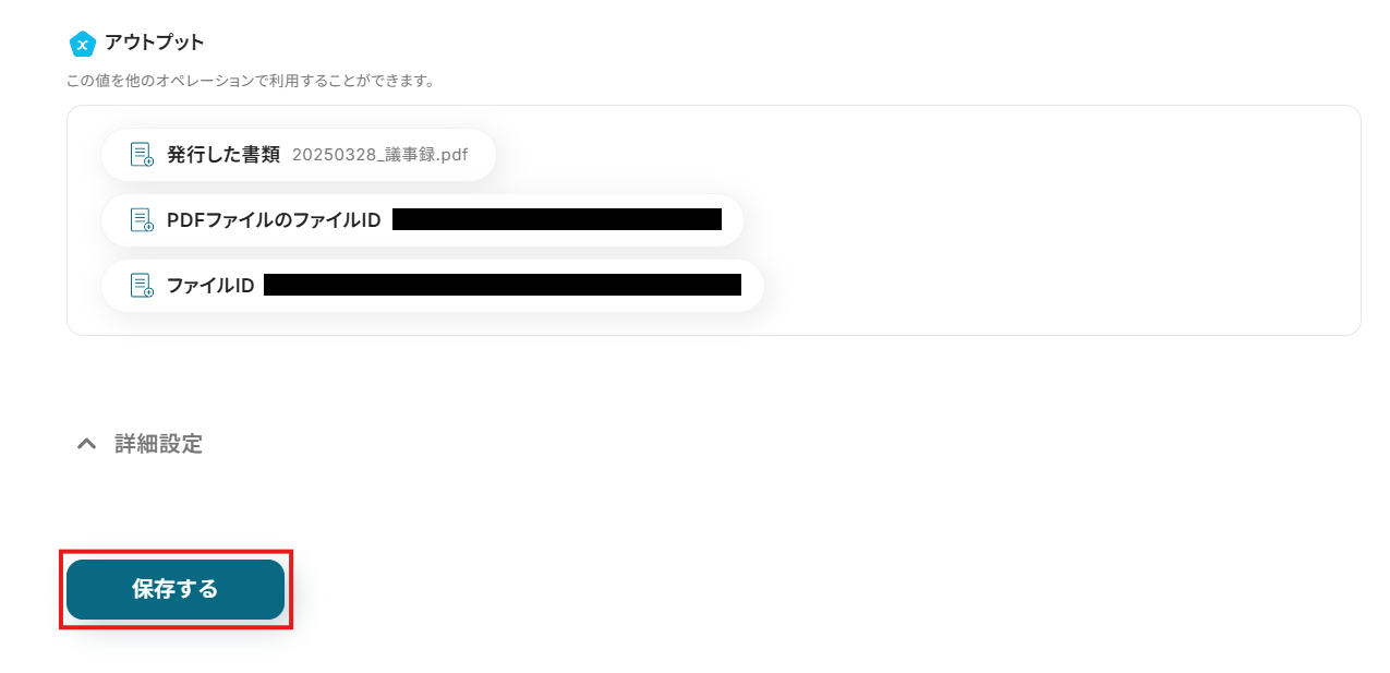 要約したテキストを元に、Boxに保存するPDFファイルを発行しましょう。