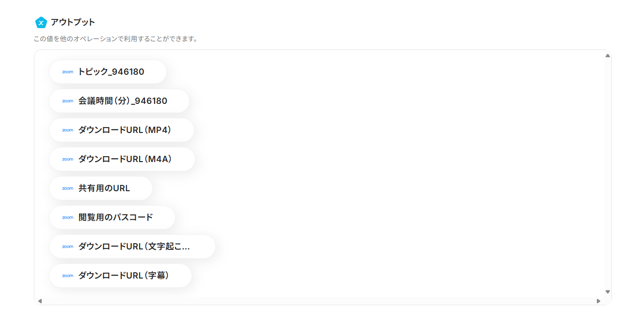 各アクションで取得した値は、入力欄クリック時に表示されるアウトプットから選択可能です。