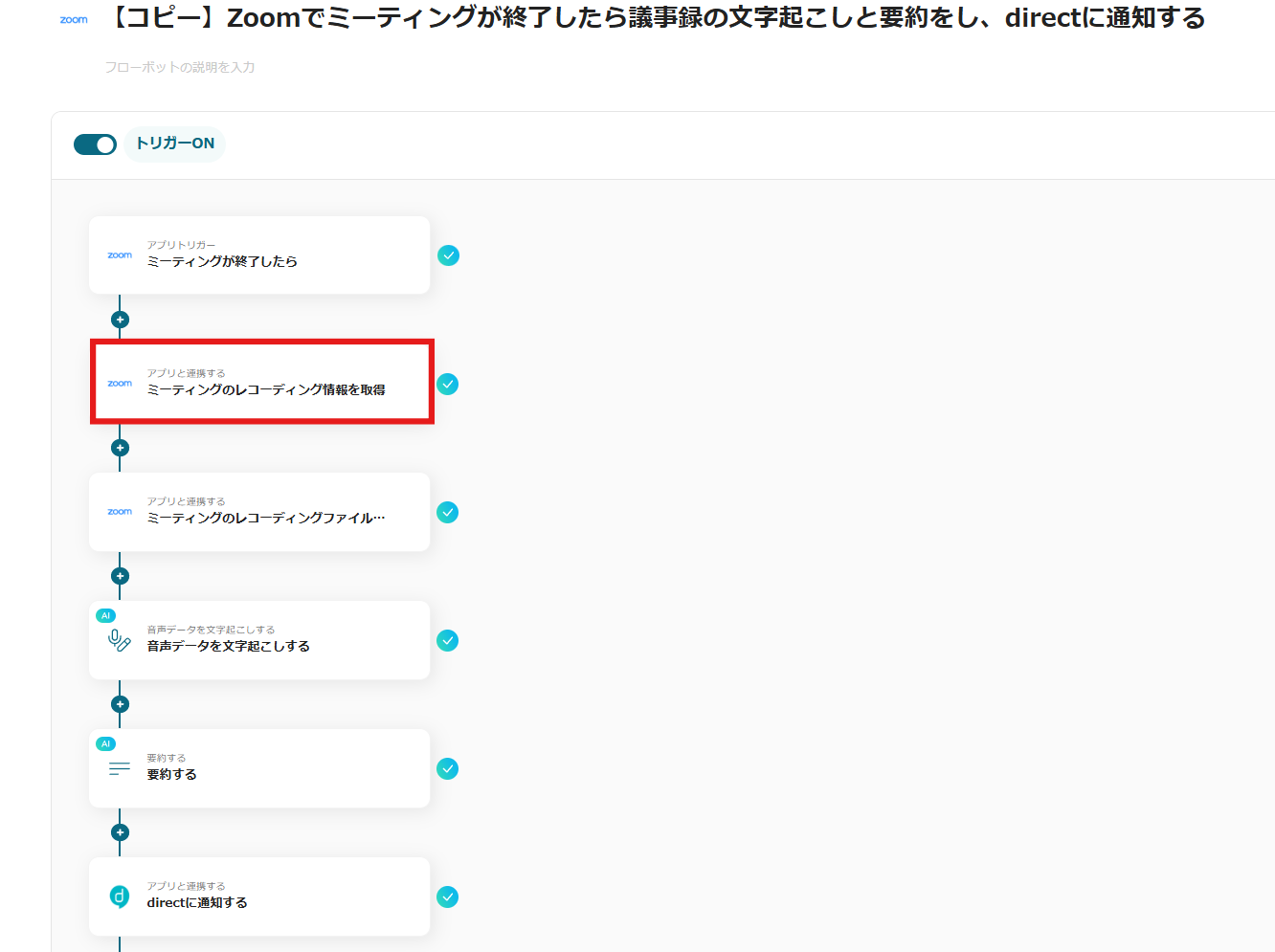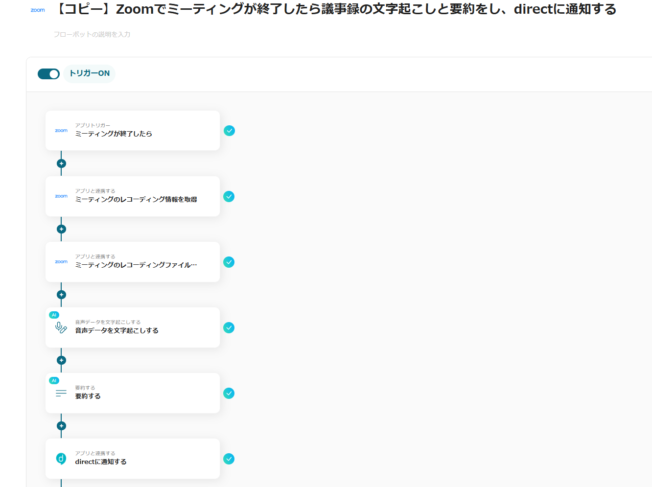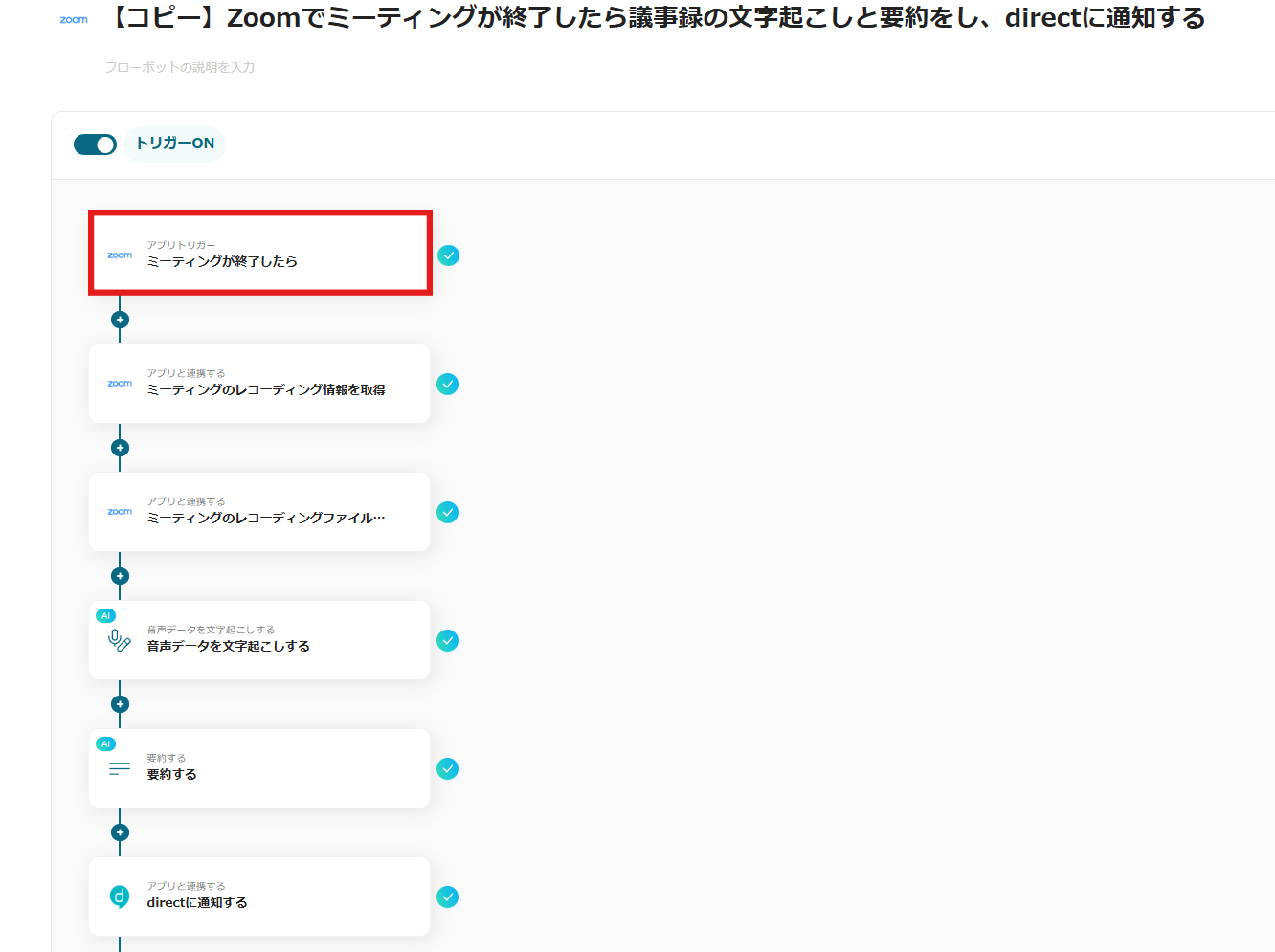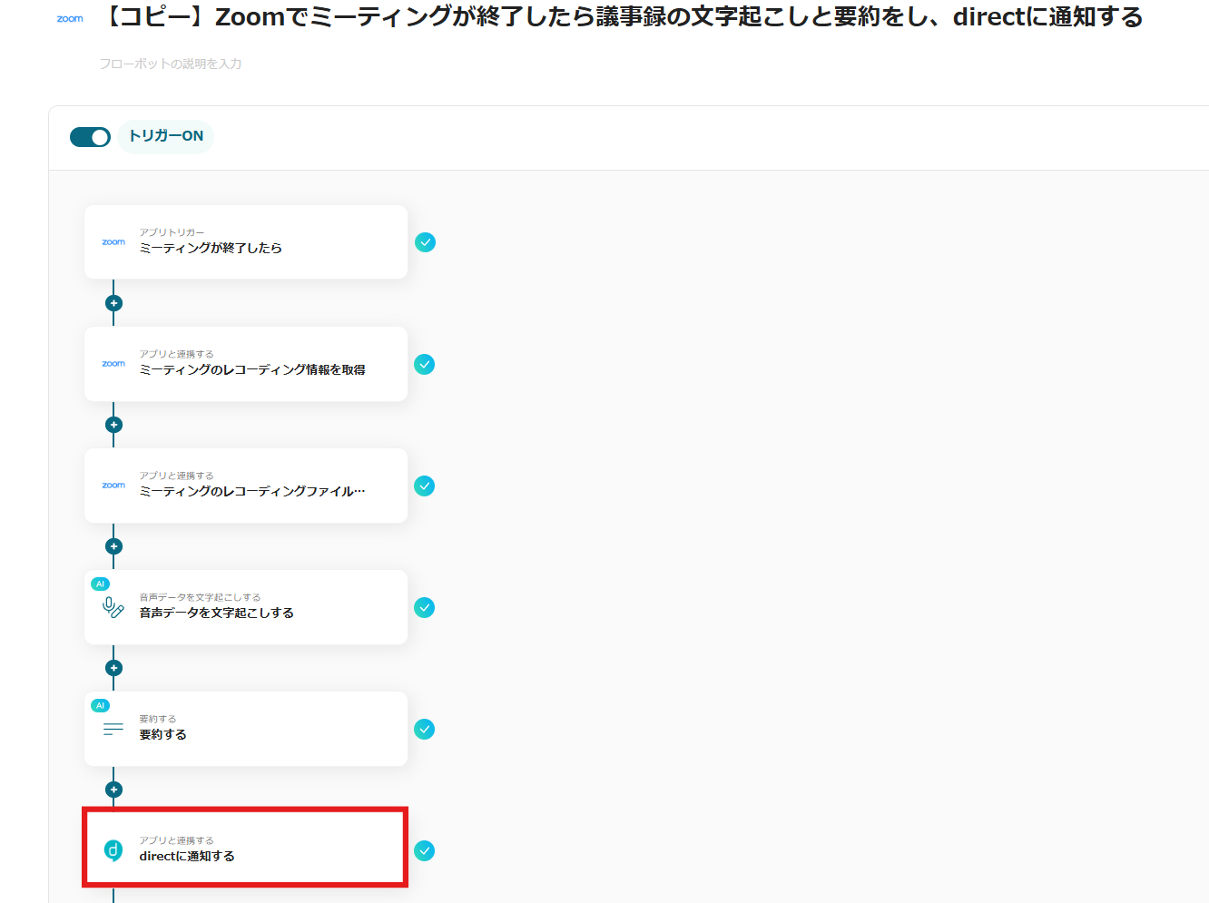 「【コピー】Zoomでミーティングが終了したら議事録の文字起こしと要約をし、directに通知する」をクリックします。
