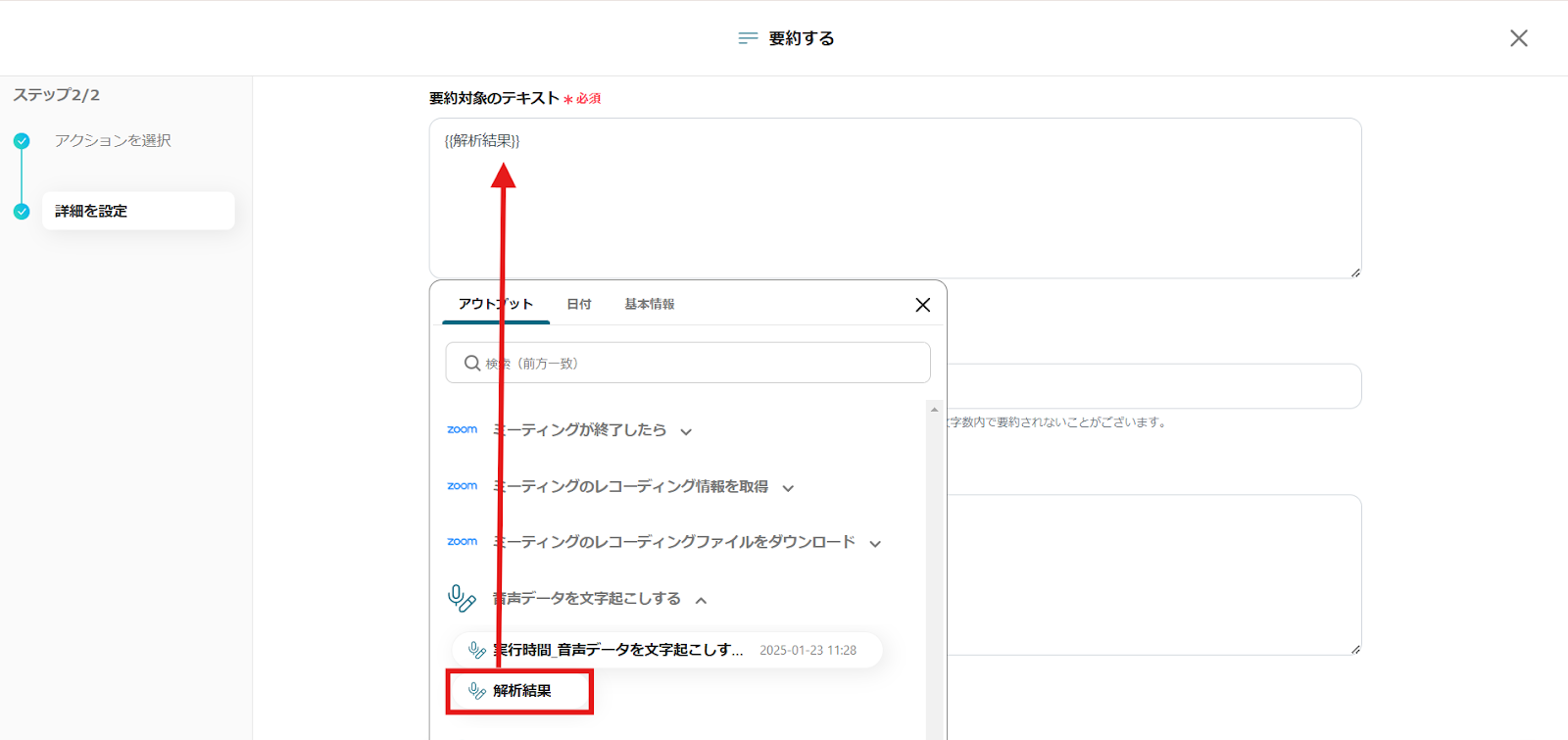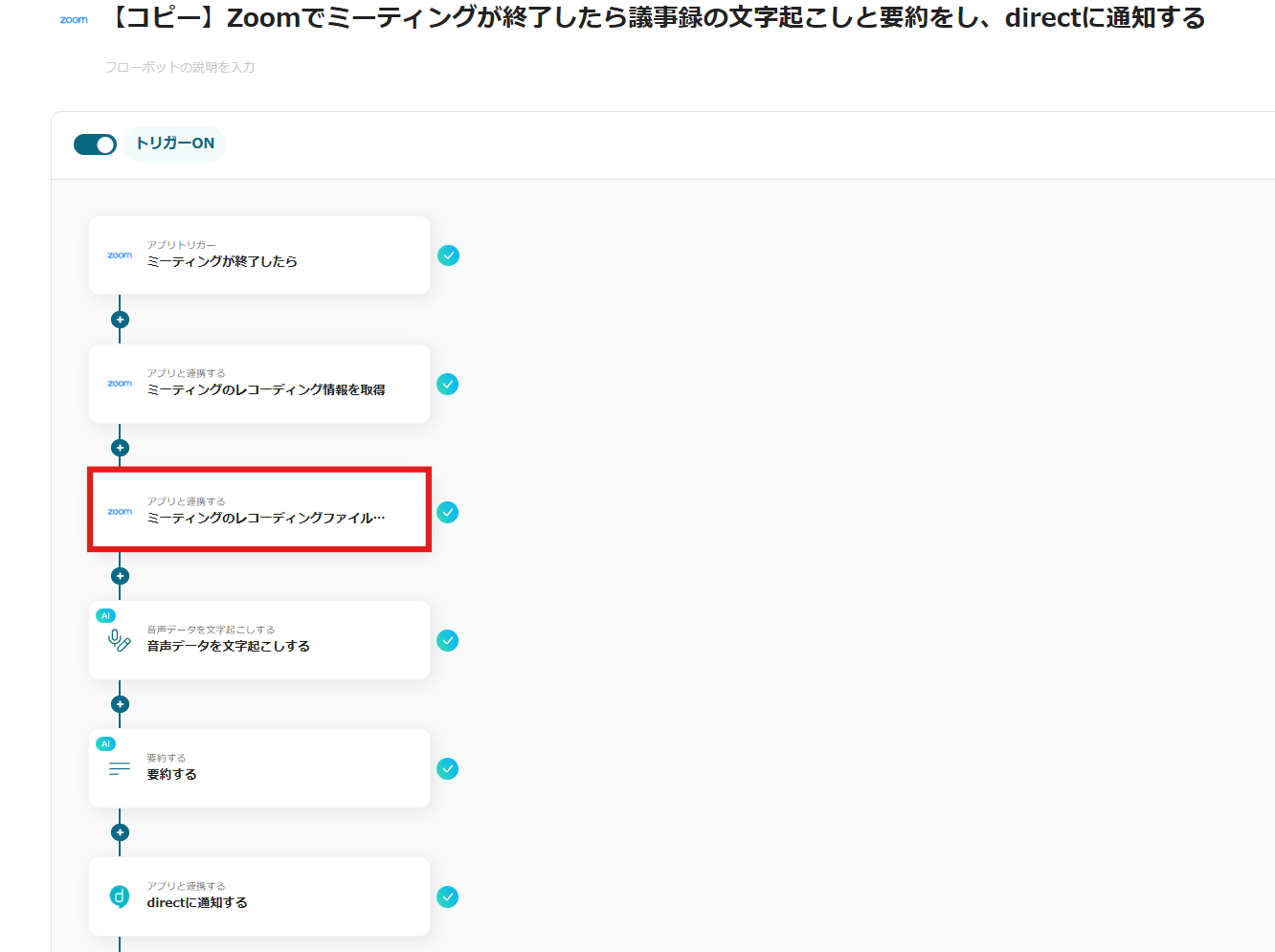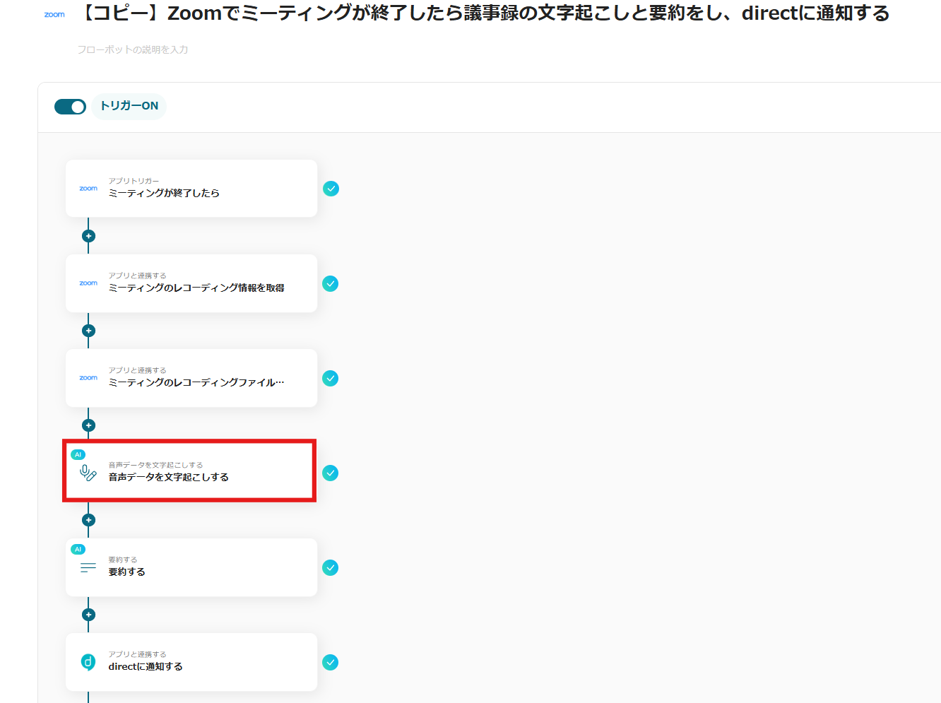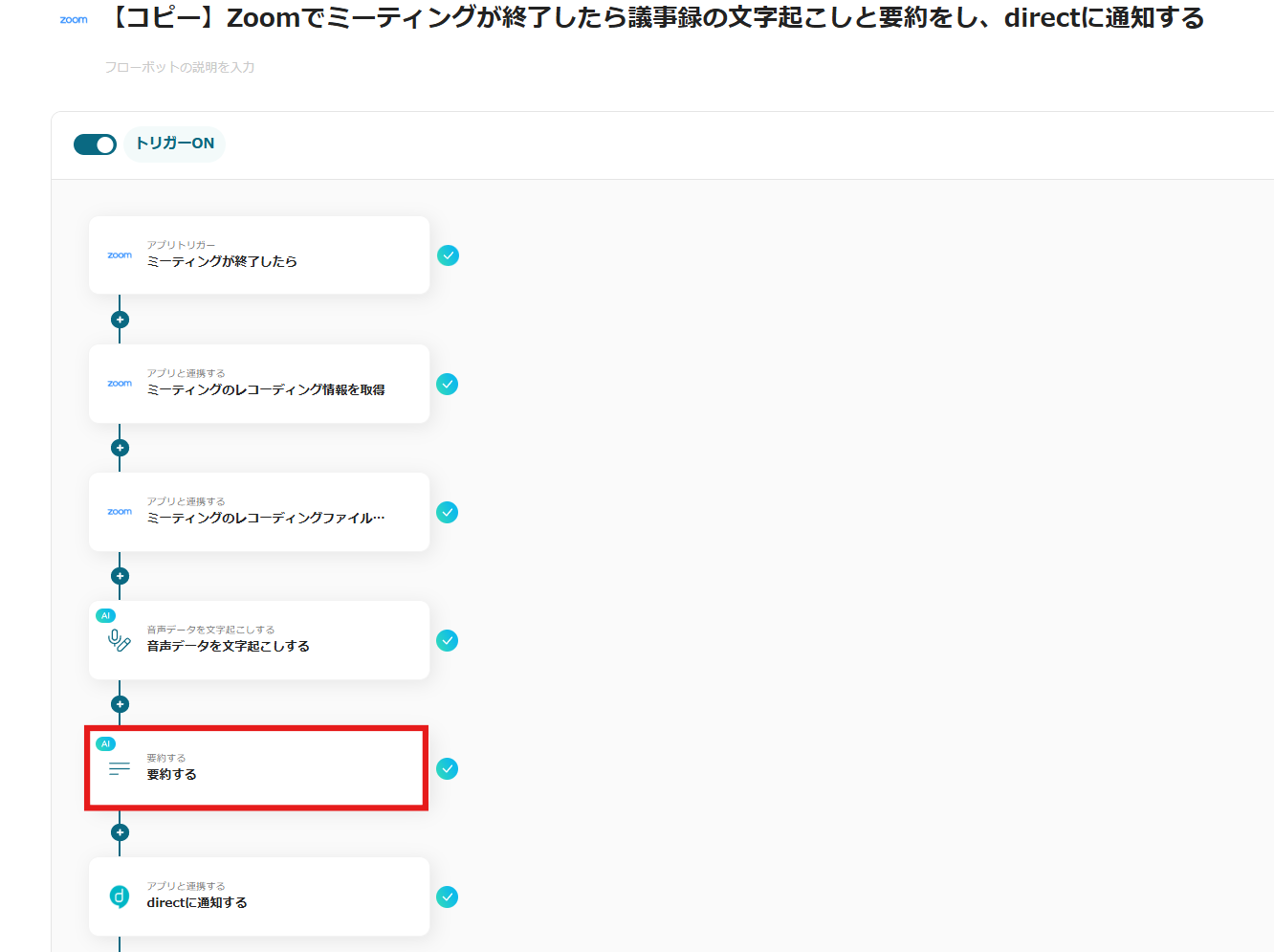 「【コピー】Zoomでミーティングが終了したら議事録の文字起こしと要約をし、directに通知する」をクリックします。