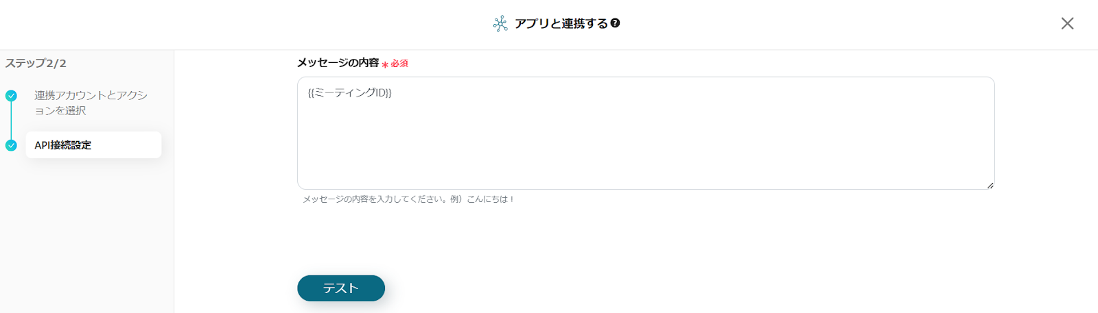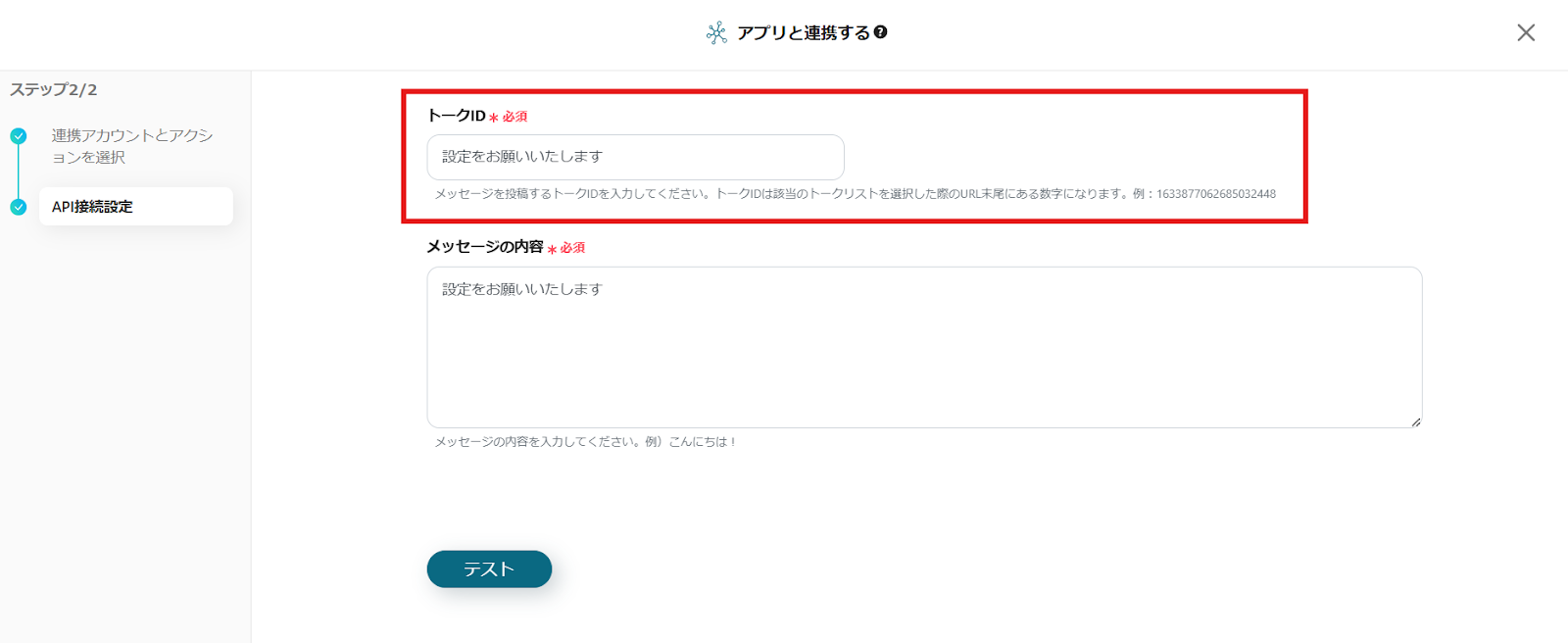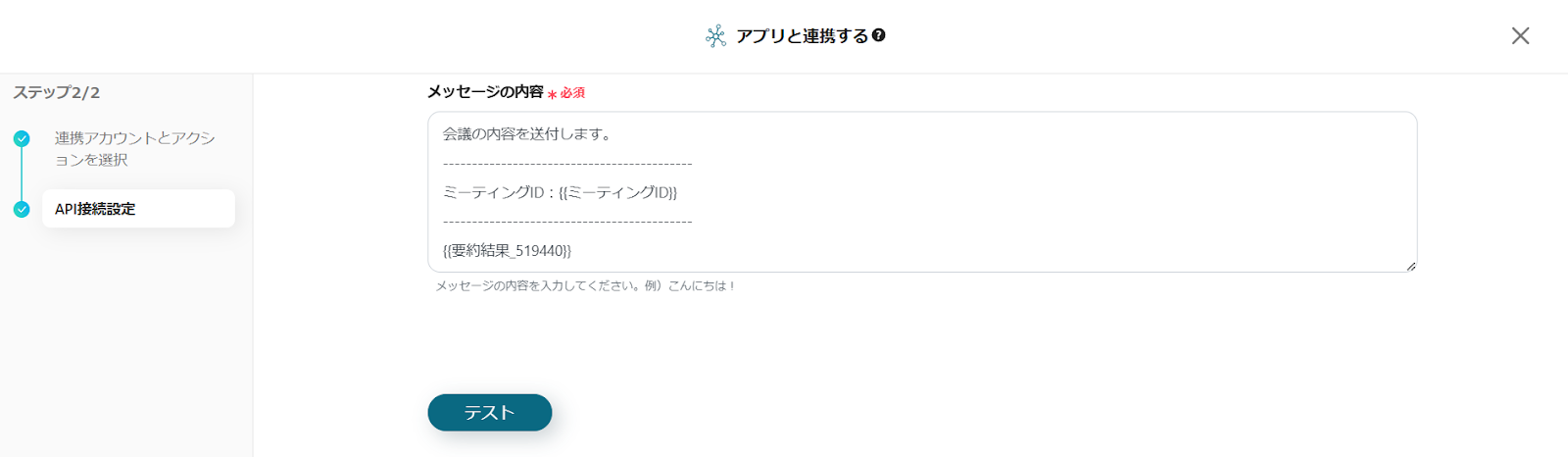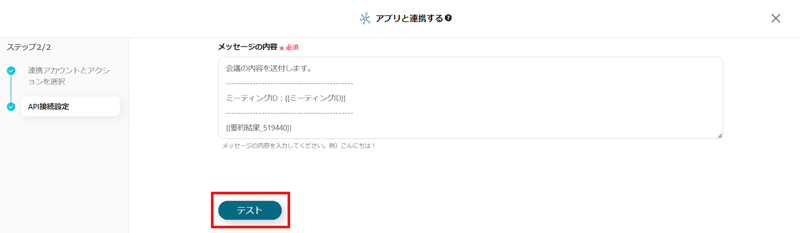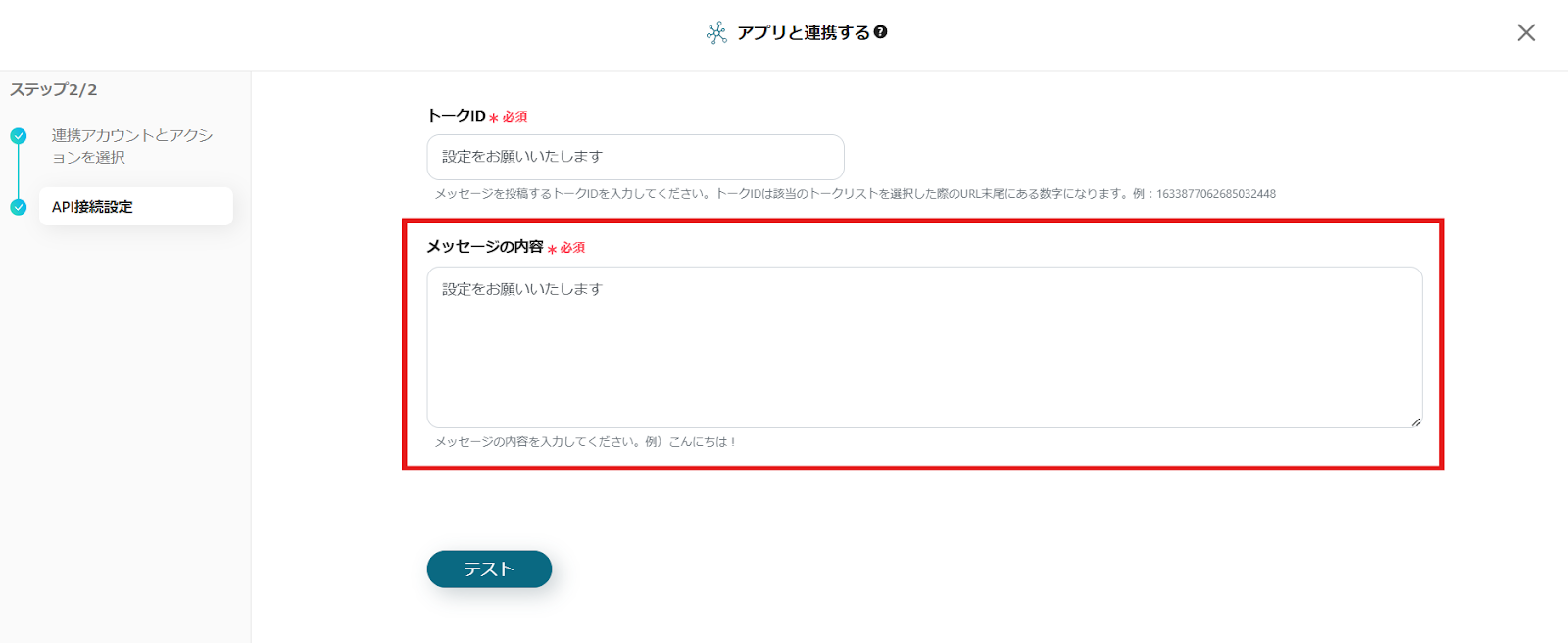 メッセージの設定ができたら、下部にあるテストボタンを押してください。
