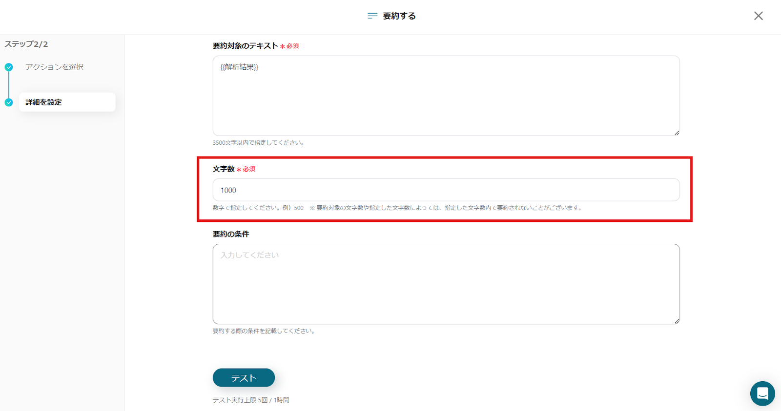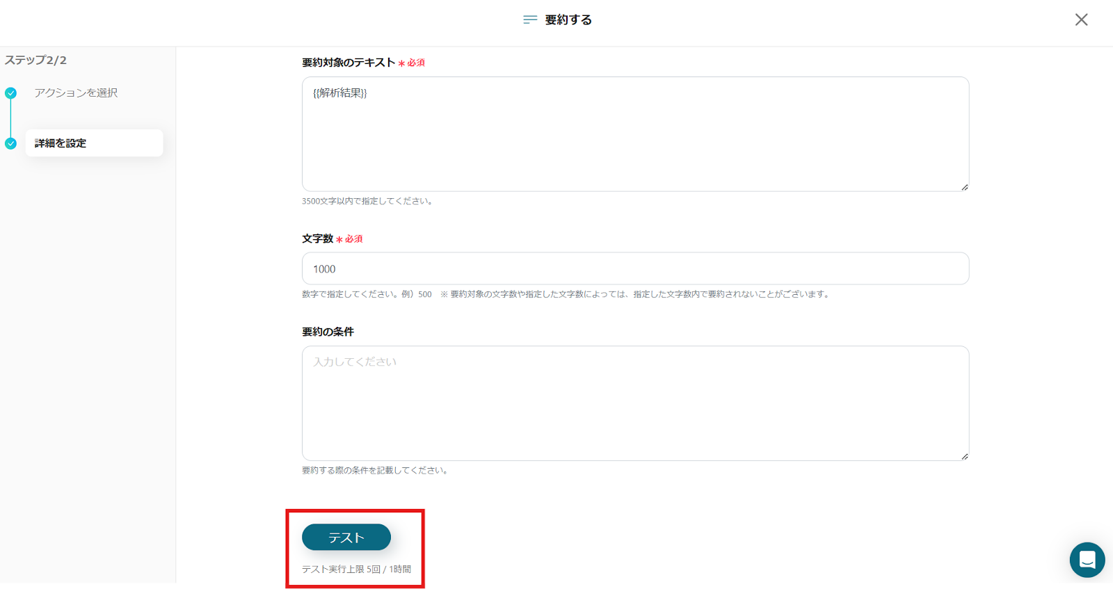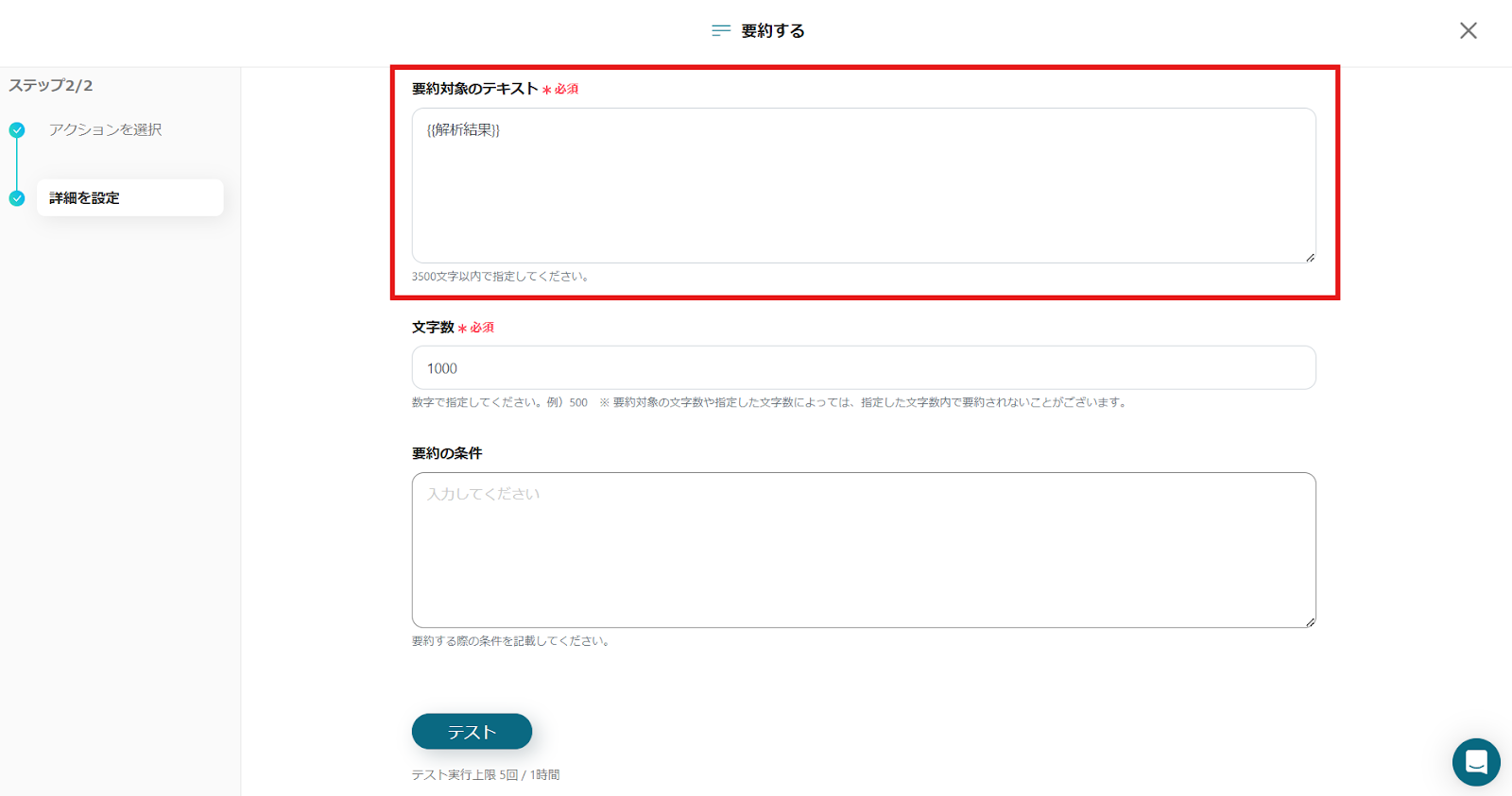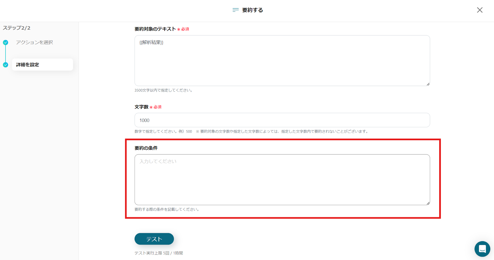 「要点のみを箇条書きしてください」などの指定をすることで、要約結果が読みやすくなるため、任意で設定をすることをおすすめします。