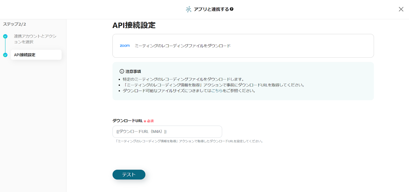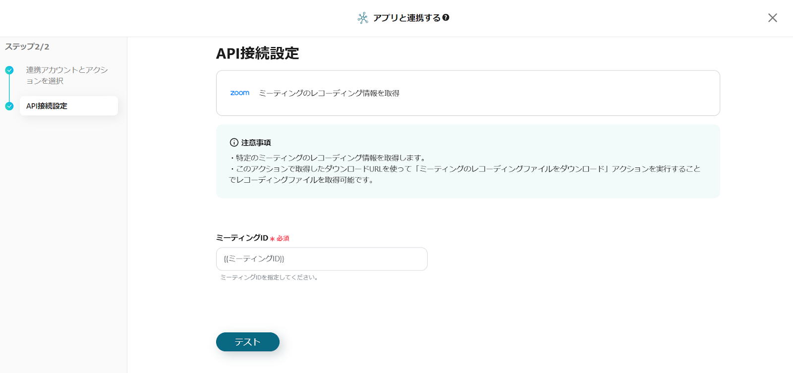 ・Zoomのレコーディング情報を取得するためには、ミーティングデータがクラウドレコーディングされている必要があります。・クラウドレコーディングはZoomの特定プランに限定されるためご注意ください。詳細はこちらをご参照ください。