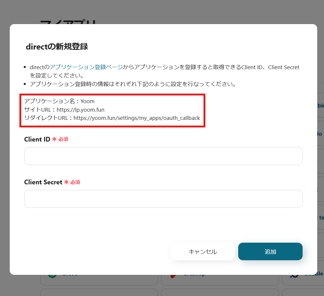 必須項目を入力します。これらの必須項目はdirectのアプリケーション登録ページから取得可能です。