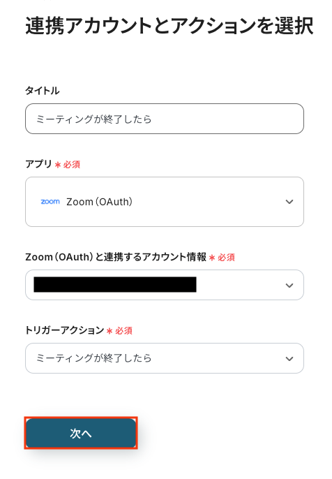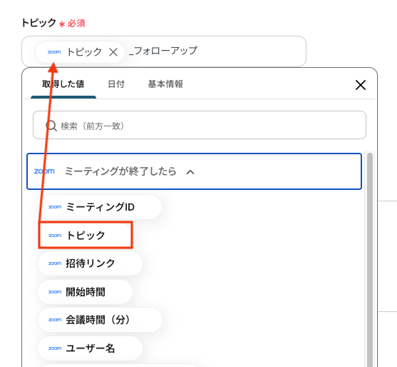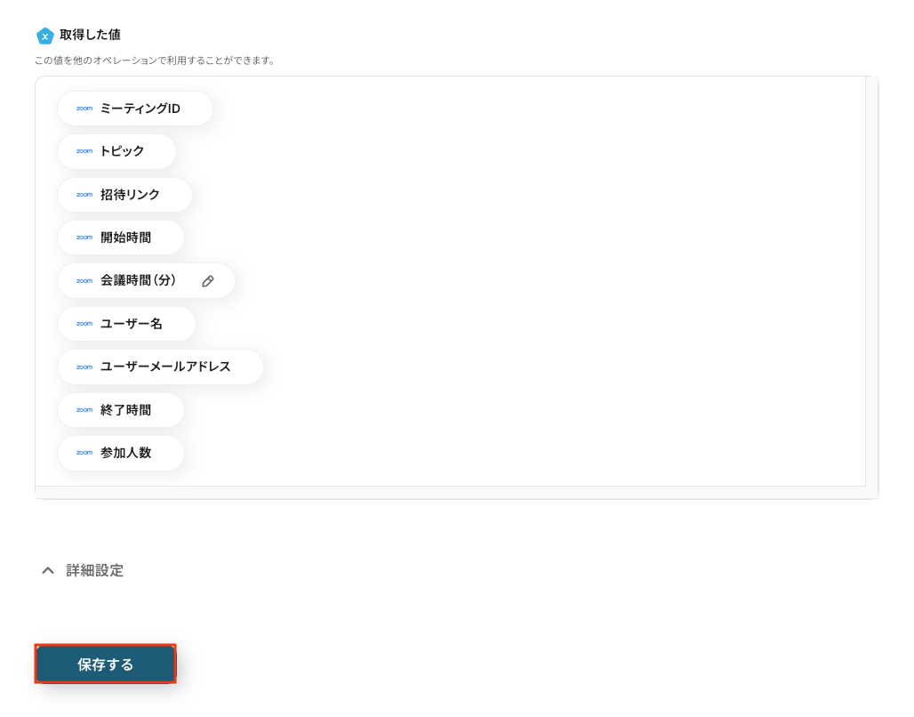 ※以下の画像に表示されていませんが、実際の連携時には「ミーティングが終了したら」のアウトプットに終了日が含まれているため、その値を利用してください。