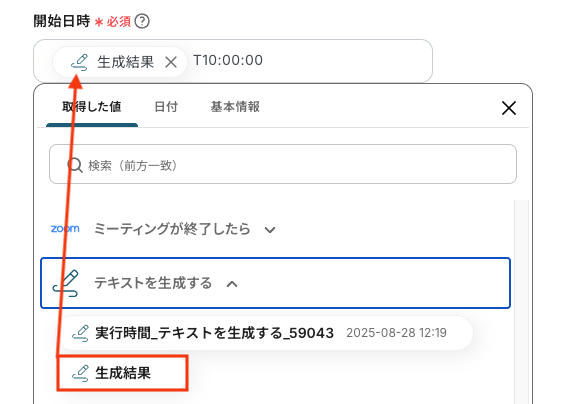 トリガーで作成・終了させたミーティングの終了日を選択して、プロンプトに挿入しましょう。