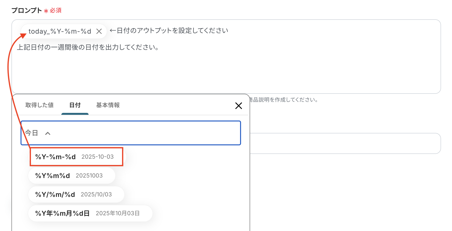 以下の画像の取得した値(=アウトプット)を利用し、この後のステップでAI機能を用いて「次回ミーティングの日付」を自動生成します。