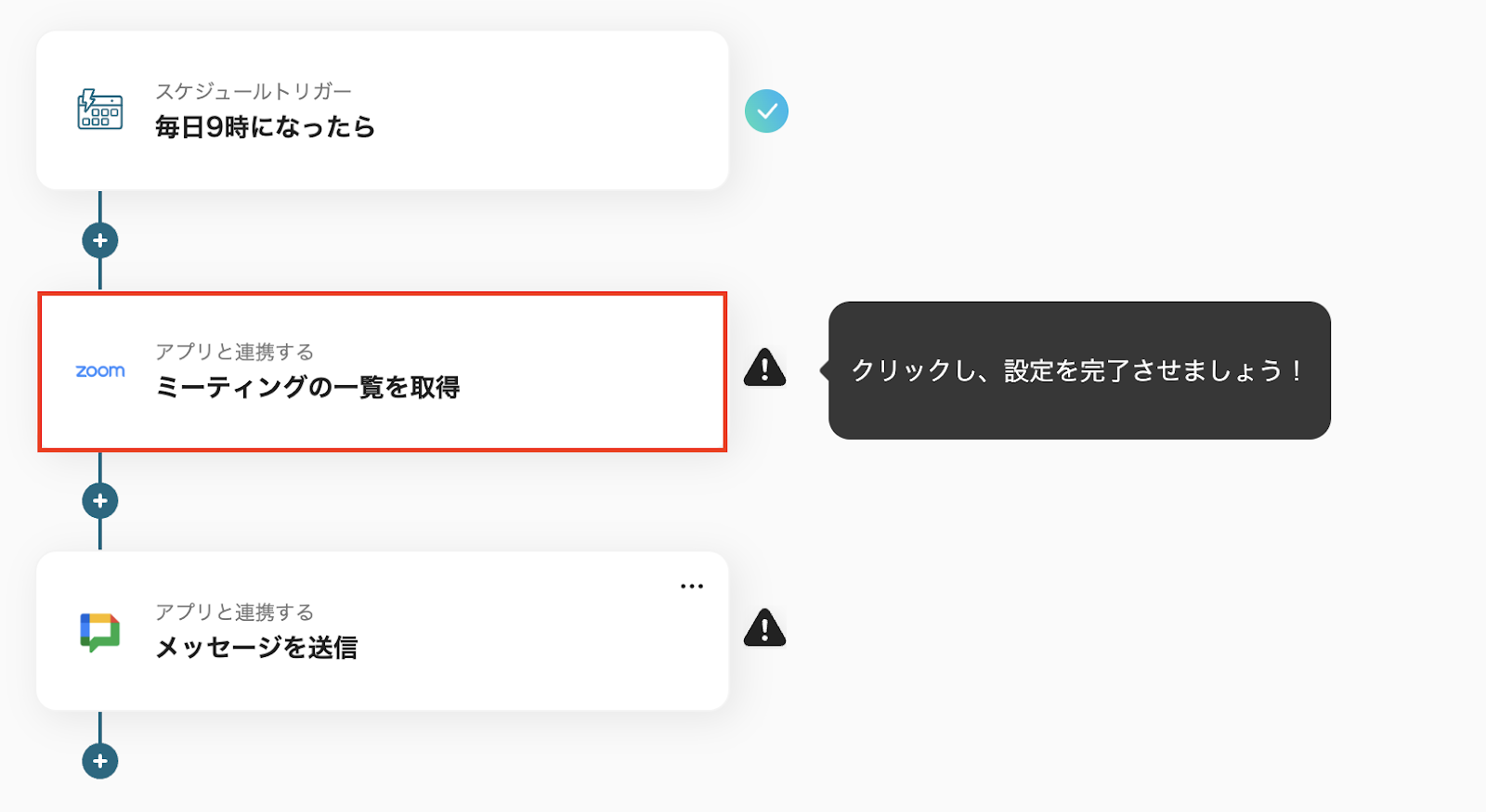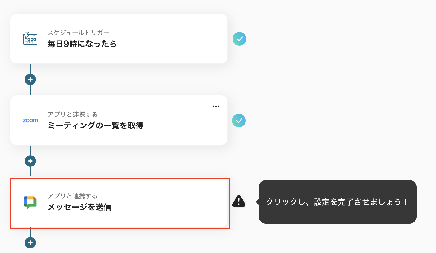 このテンプレートを使うと、Zoomで予定されている会議情報をGoogle Chatで毎日通知できます。