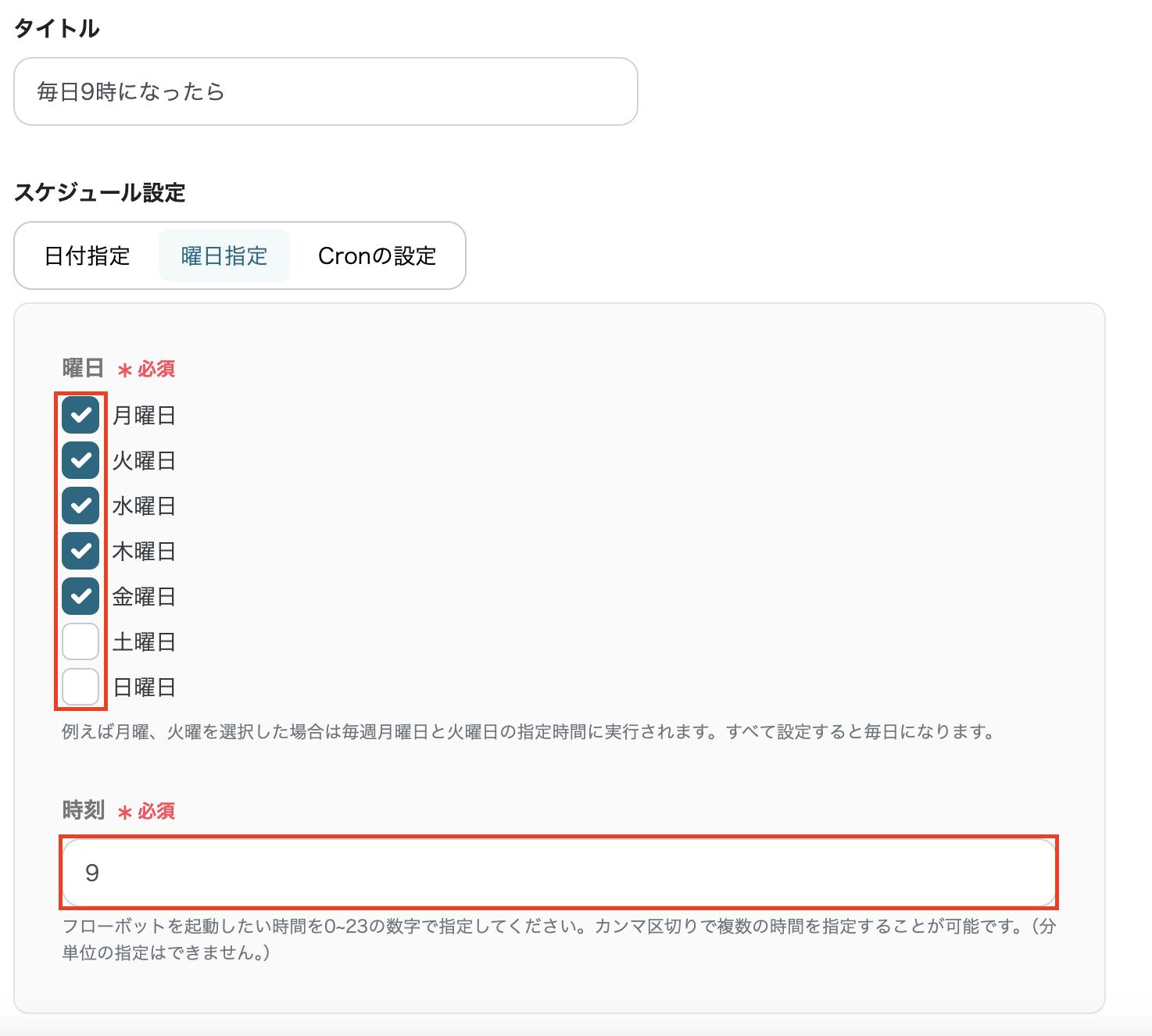 ・時刻には、フローボットを起動したい時間を入力しましょう。