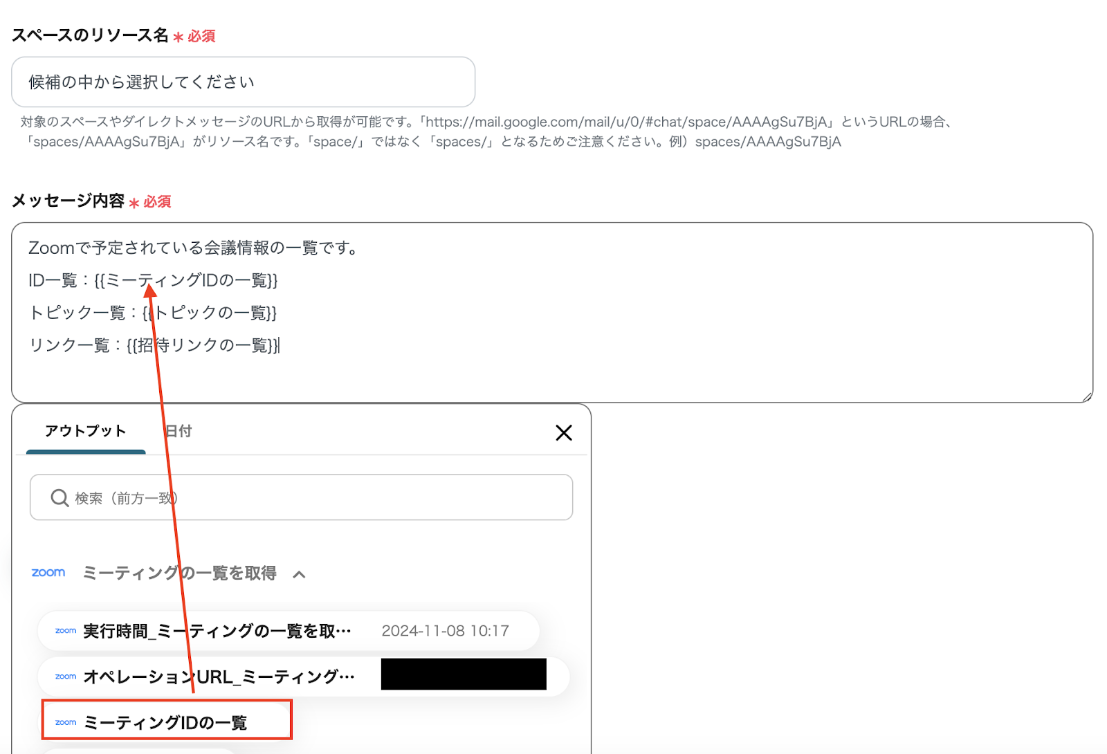 ・メッセージ内容には、添付画像のようにZoomのアクションで取得したアウトプットを選択しながら入力しましょう。