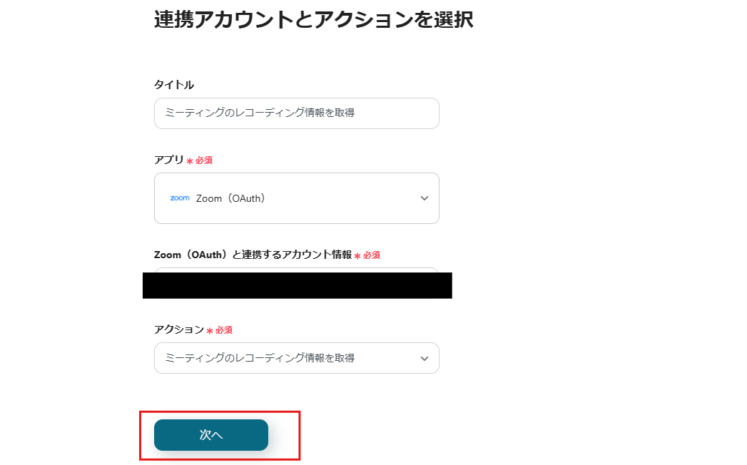 連携するアカウント情報を確認し、アクションはテンプレート通りのまま「次へ」をクリックして進んでください。