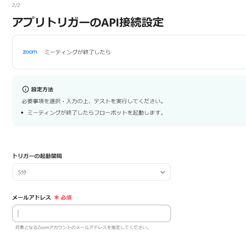 5)トリガーの起動間隔を選択し、対象となるZoomアカウントのメールアドレスを指定してください。
