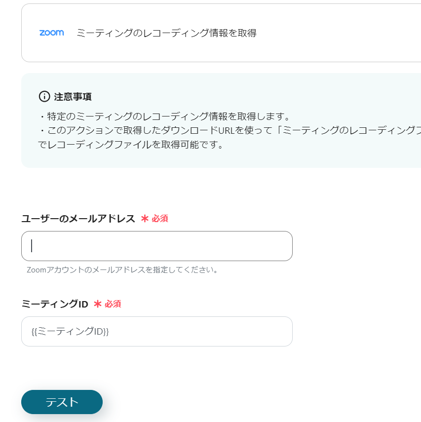 ・Zoomのレコーディング情報を取得するためには、データがクラウドレコーディングされている必要があります。