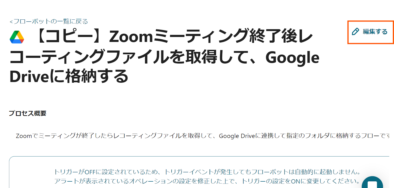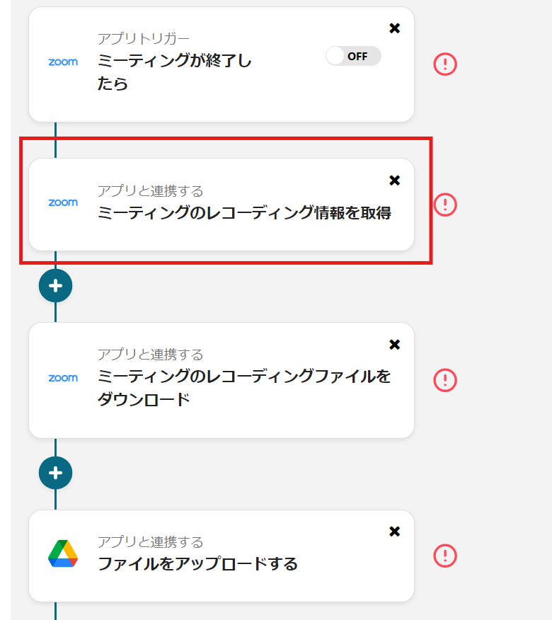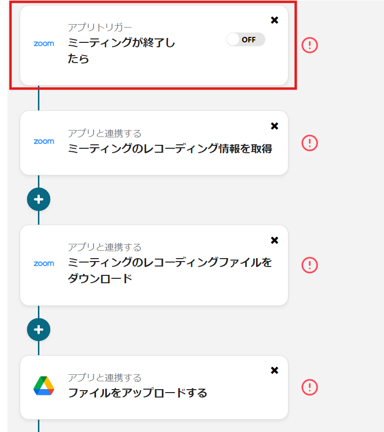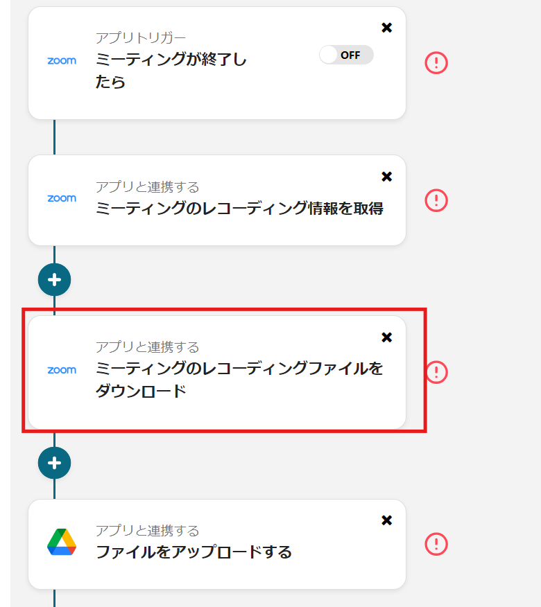 Zoomでミーティングが終了したらレコーティングファイルを取得して、Google Driveに連携して指定のフォルダに格納するフローです。