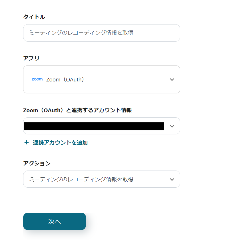 7)アクションは「ミーティングのレコーディング情報を取得」を選択し、「次へ」をクリックします。