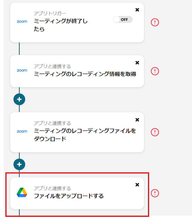 15)これで【Zoomミーティング終了後レコーティングファイルを取得して、Google Driveに格納する】フローの完成です。