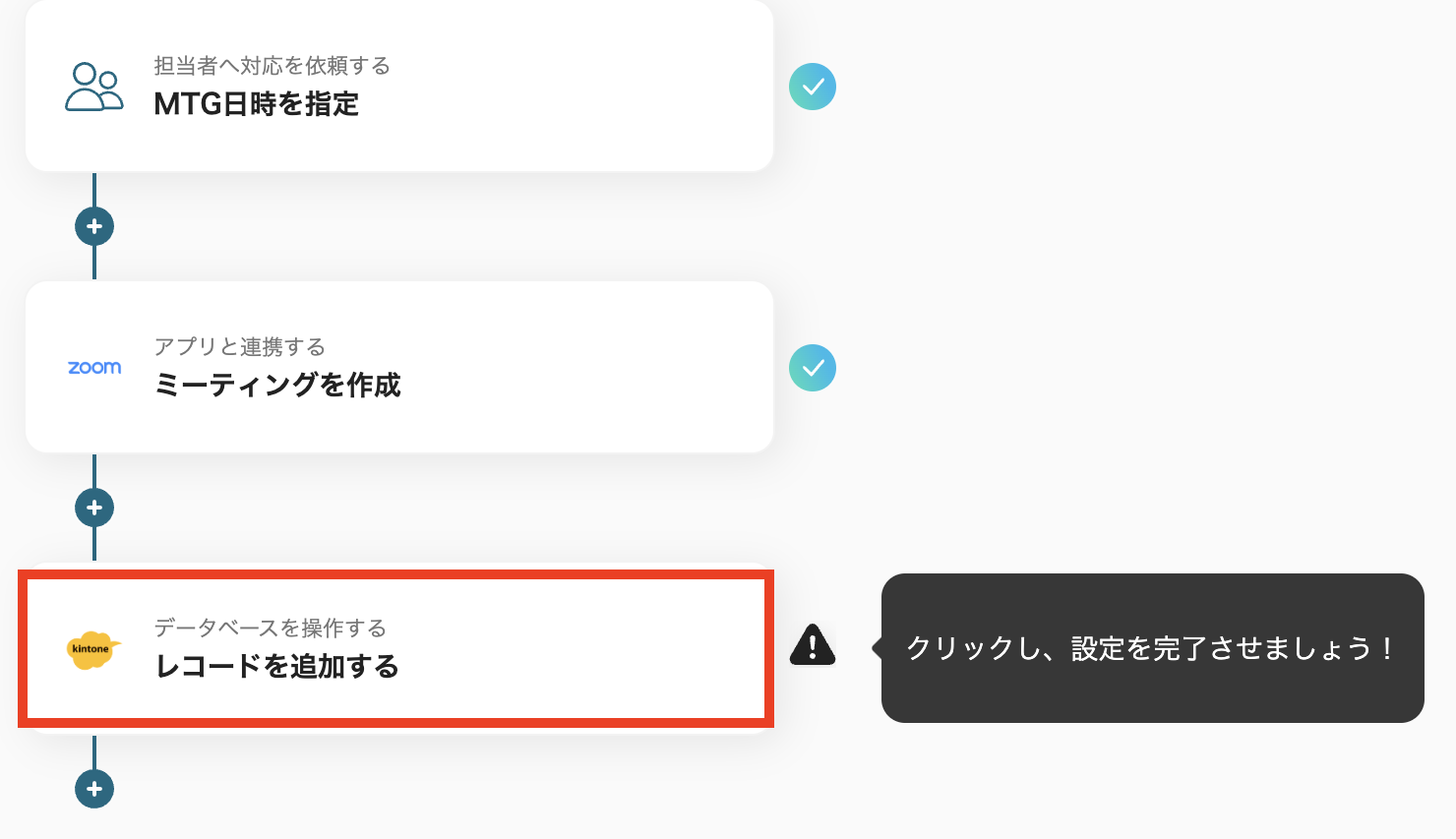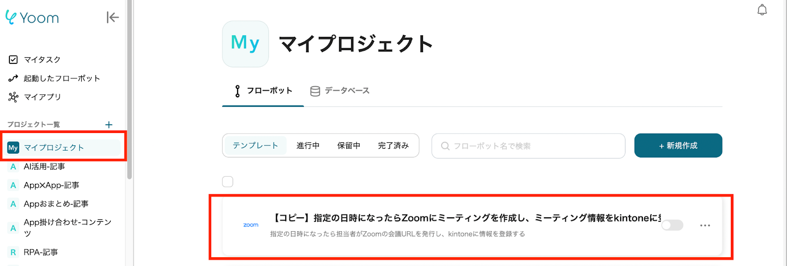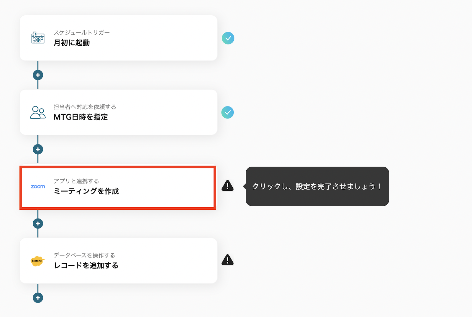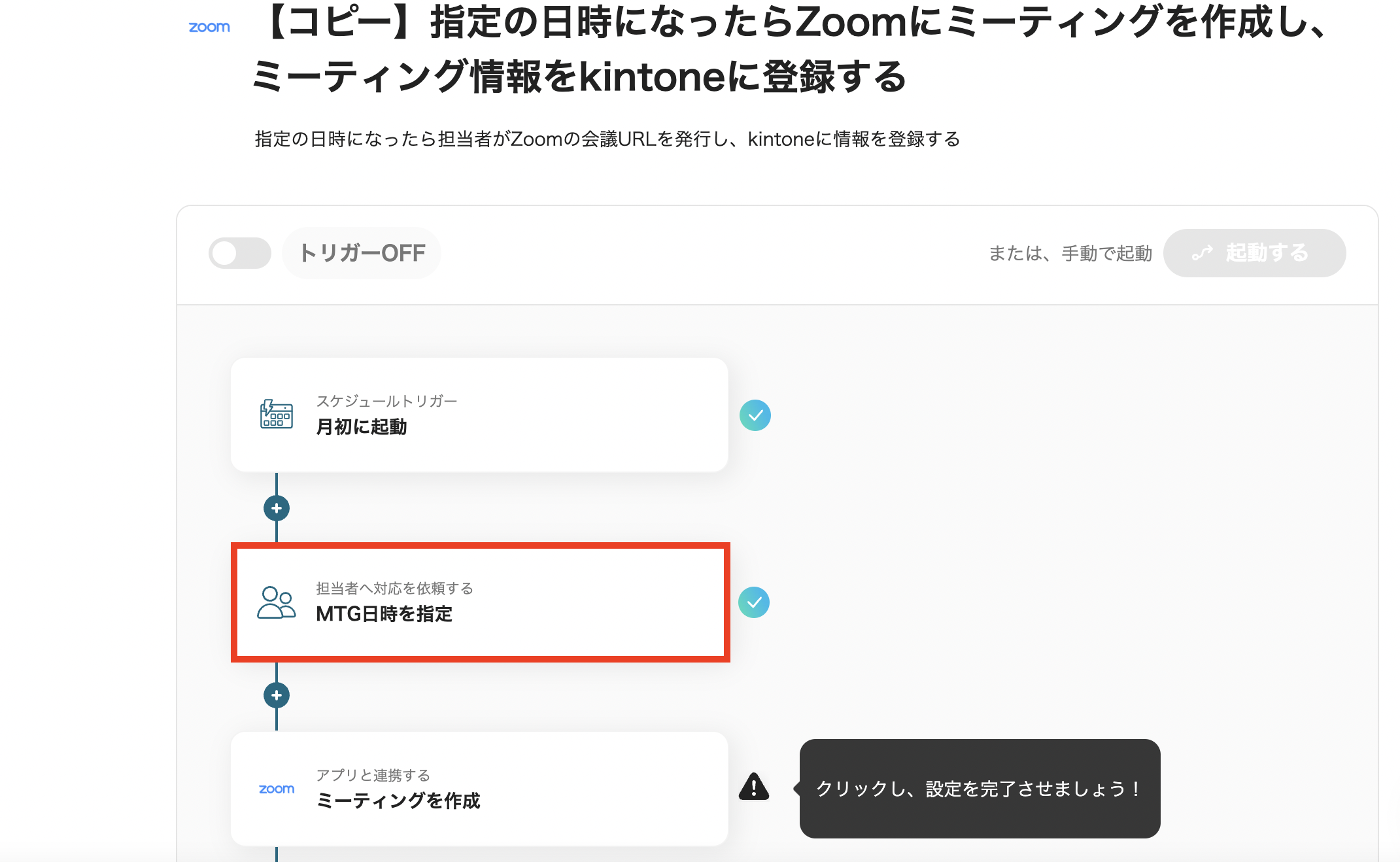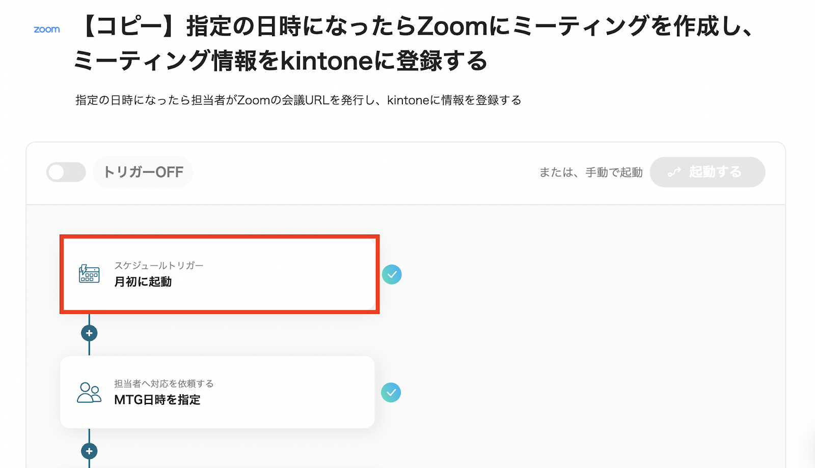 このフローの活用により、Kintoneでのレコード作成によってZoomミーティングを自動作成することができます。ミーティング作成の自動化を目指す方におすすめです。