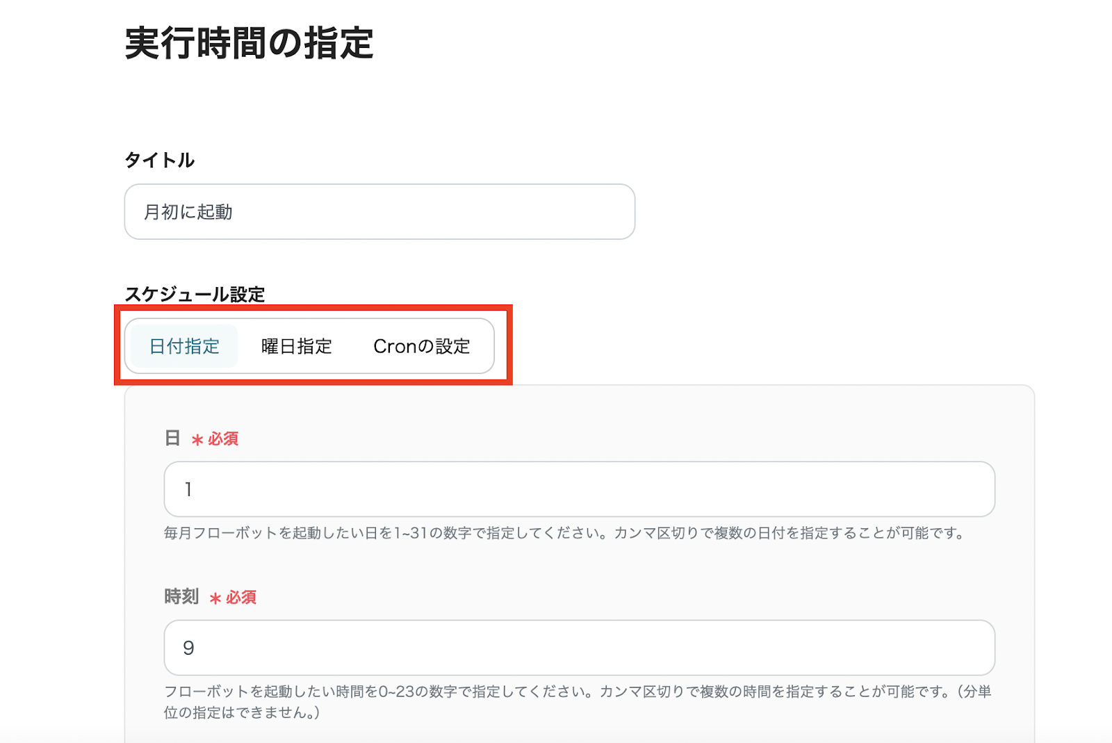 画像では、毎月1日午前9時に起動する設定となっていますが、日付での指定だけでなく、毎週◯曜日に起動するなどの「曜日指定」も可能です。