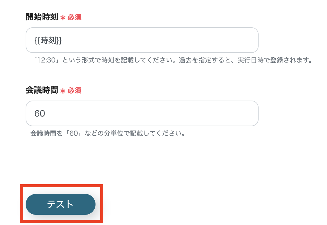 全ての項目に入力が終了したら、「テスト」をクリックします。