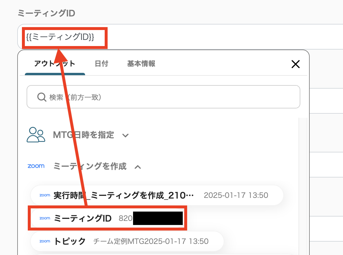 kintoneアプリで設定した項目に、Zoomで取得したアウトプットを設定していきます。