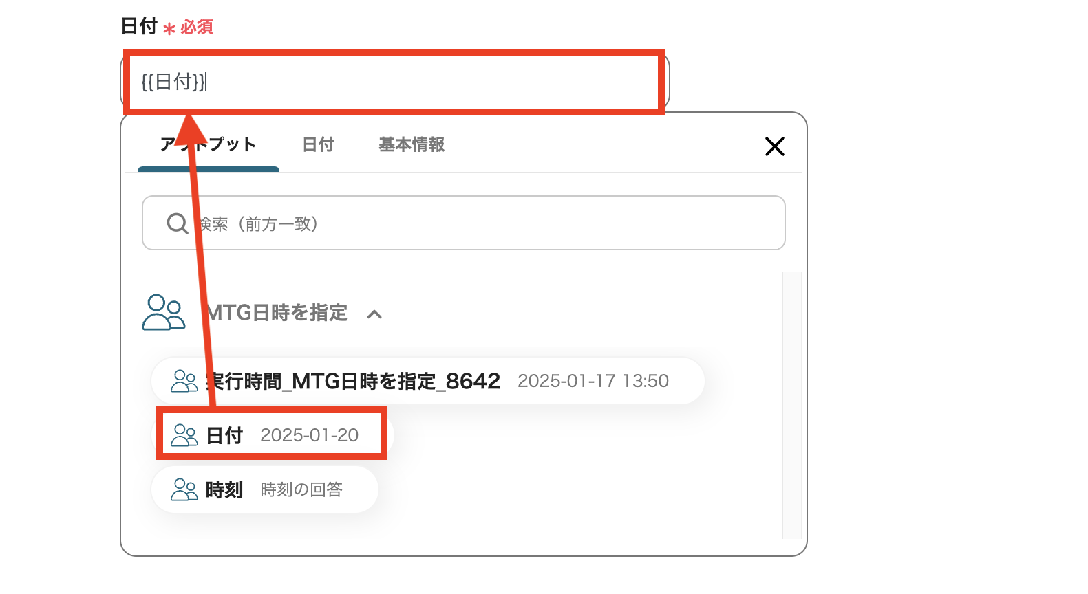会議の日付、開始時刻、会議時間などは、アウトプット欄から設定可能です。