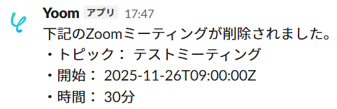 以上が、Zoomのミーティングが削除されたら、Slackにキャンセル通知を送信する方法でした!