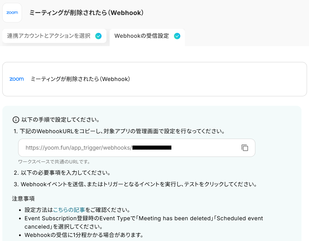まずZoomのWebhook登録方法を参考に、Zoomの設定画面でWebhookイベント受信設定をしてください。