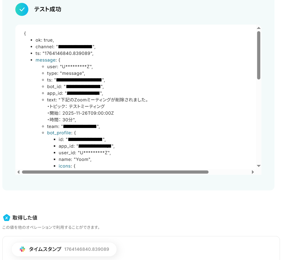 先ほど取得した、削除済みミーティング情報をSlackで通知します。
