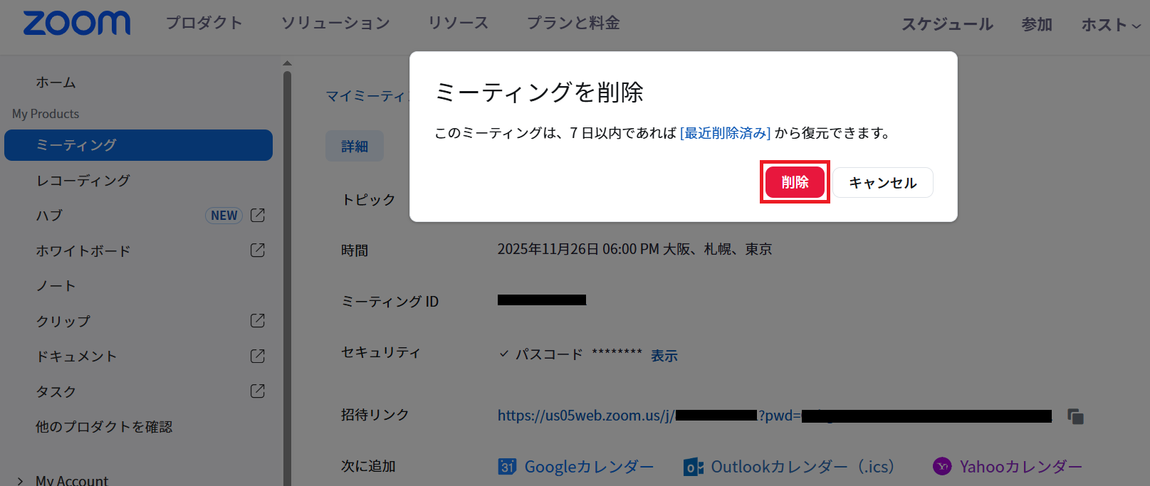 次にテスト用のミーティングを作成し、削除してください。