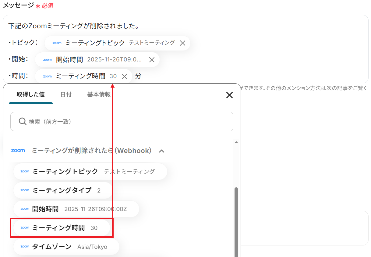 メッセージは予め設定されていますが、Zoomから取得した値などの変数や固定のテキストを組み合わせて自由にカスタマイズできます。