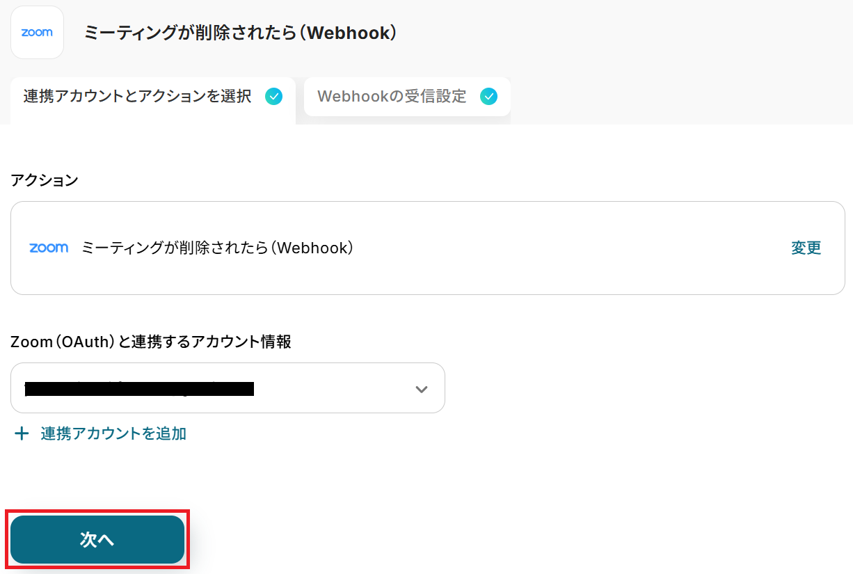 タイトルと連携するアカウント情報を任意で設定し、アクションはテンプレート通りに「ミーティングが削除されたら(Webhook)」のまま「次へ」をクリックします。