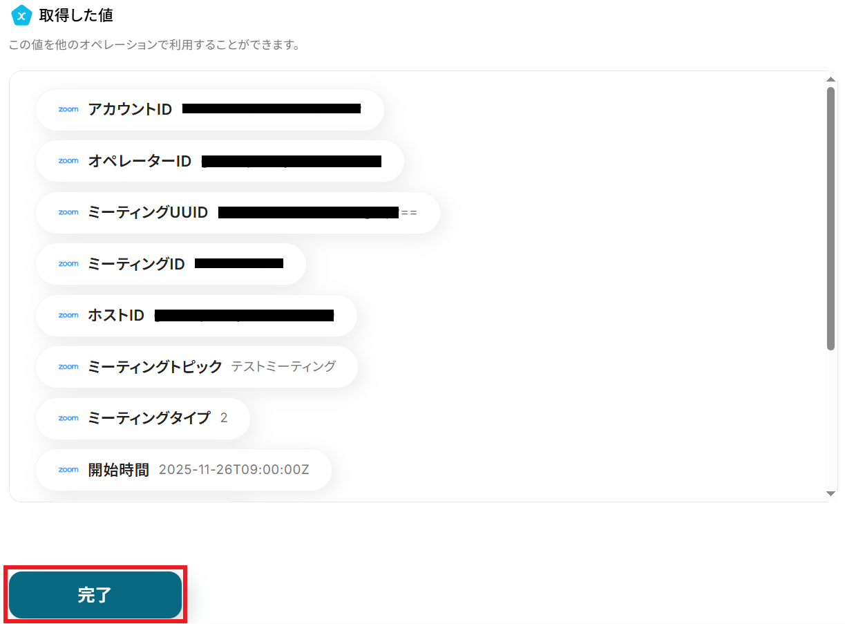 - Zoomでミーティングを作成するアクションでは、トピックや開始時間などをGoogle スプレッドシートから取得した値を用いて自由に設定できます