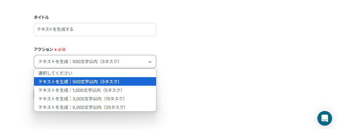 アクションをクリックすると、生成するテキストの文字数を選択することができます。