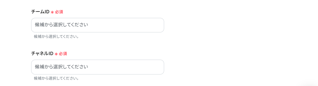 チームIDとチャンネルIDは、枠内をクリックし表示される「候補」より任意で設定してください。