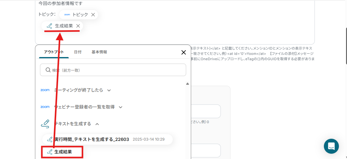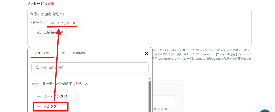 下記画面のように設定すると、Zoomウェビナーが終了したら、Zoomの「トピック」と先ほど生成した「生成結果」を自動で取得しMicrosoft Teamsに通知できますよ!