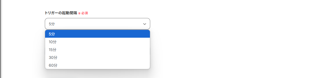 トリガーはプルダウンから5分/10分/15分/30分/60分の間隔で起動間隔を選択可能です。