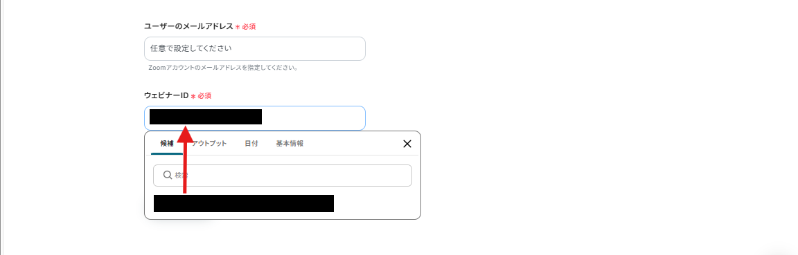ウェビナーIDは、枠内をクリックし表示される「候補」より任意で設定してください。