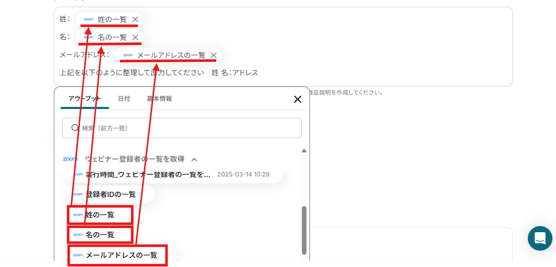 このように設定すると、Zoomウェビナーが終了したら参加者情報の「姓の一覧」「名の一覧」「メールアドレスの一覧」を自動で取得し、「姓 名:アドレス」の形式にテキストを生成することができますよ!