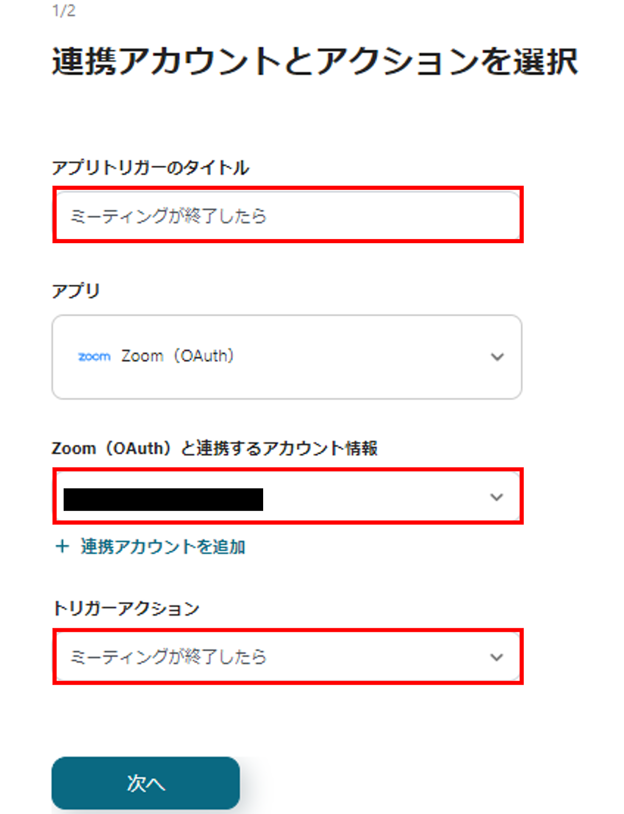 ※アウトプットを設定するポイントは、一つ前のアプリトリガーで設定したZoomの情報をアウトプットで活用できることです。
