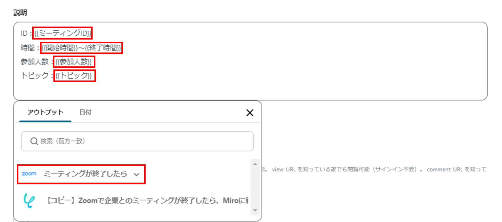 (7)説明を設定:今回は、アウトプットから{{ミーティングID}}、{{開始時間}}、{{終了時間}}、{{参加人数}}、{{トピック}}を設定してみました。