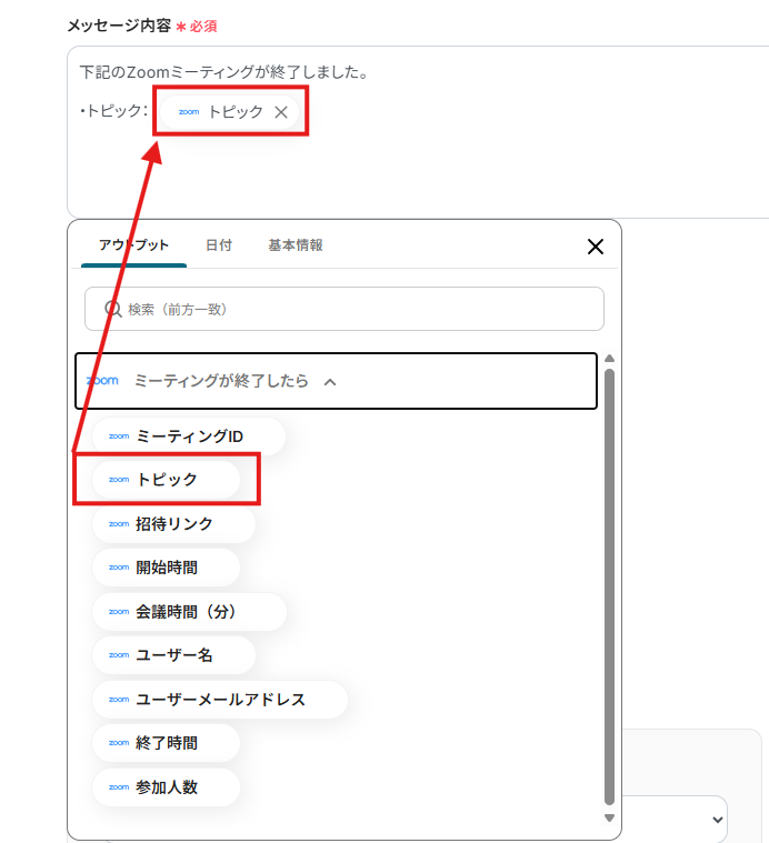 「メッセージ内容」は、入力欄をクリックして表示されるアウトプットから選択できます。
