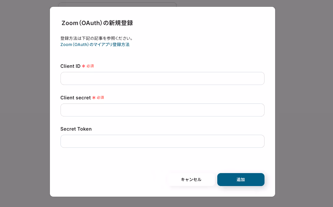 (2)Zoom(OAuth)のアプリアイコンが出てきますので、そちらをクリックします。 (3)連携するZoomの「Client ID」と「Client secret」「Secret Token」を入力します。 Zoom(OAuth)のマイアプリ登録方法の詳しい手順はこちらのページ に記載されています。 情報を入力した後、[追加]をクリックしましょう。
