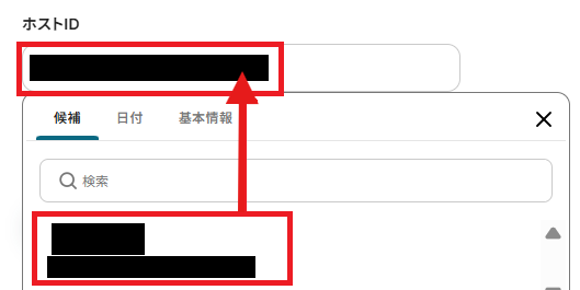 設定しおわったらYoomのフローに戻ります。ホストIDを入れていきましょう。
