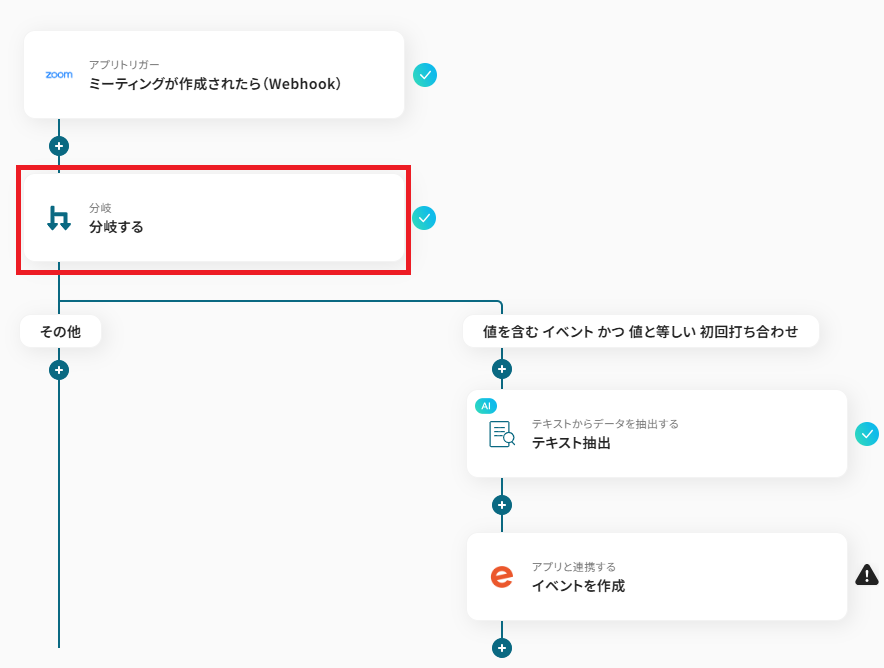 - 次に、オペレーションで「分岐機能」を設定し、特定の条件を満たすミーティングが作成された場合のみ、後続の処理に進むよう設定します