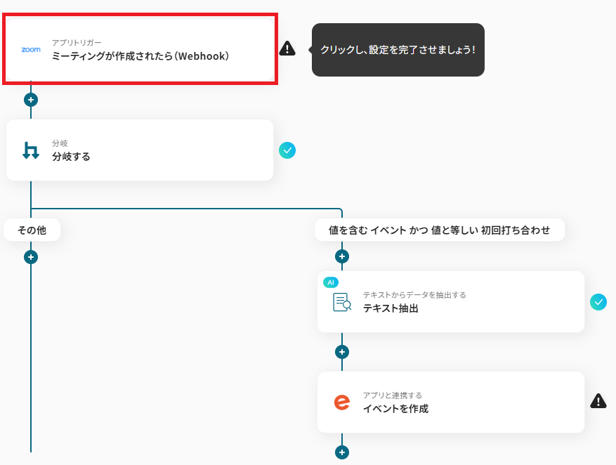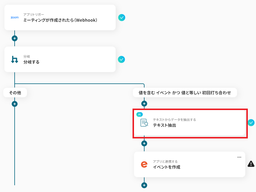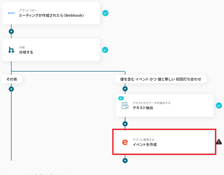 今回はトピック内に「イベント」というワードが含まれ「初回打ち合わせ」が一致する場合のみフローを進行させるように設定してあります。