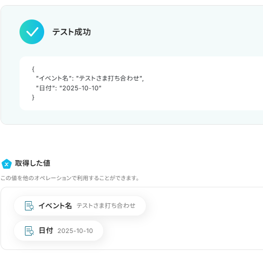 テストが成功し、取得した値が入ればOKです。