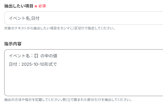 - AI機能では、Slackのメッセージから抽出したい項目(イベント名、開催日時、場所など)を任意で指定することが可能です。