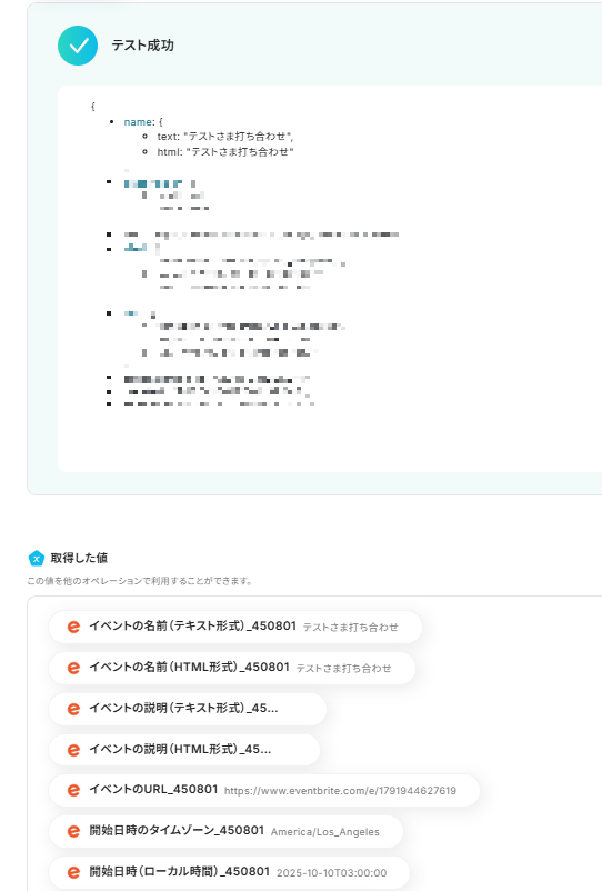 - Eventbriteでイベントを作成する際、前段のAI機能で抽出した情報を引用し、イベントタイトルや概要などの各項目に自由にマッピングできます。