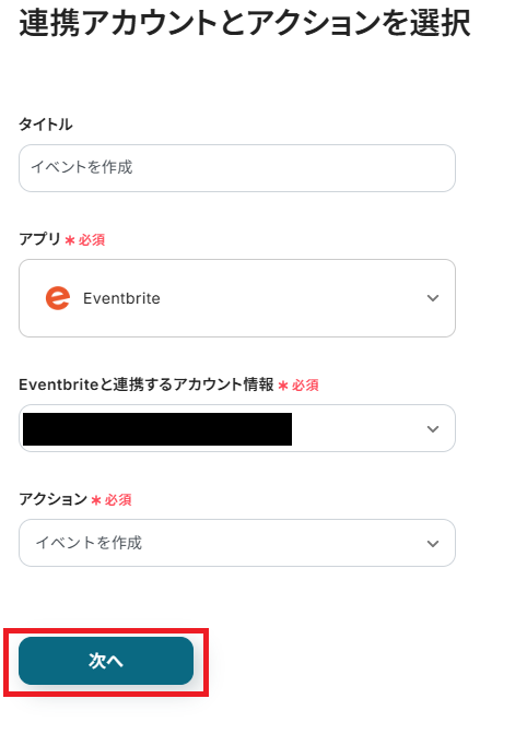 - 最後に、オペレーションでEventbriteの「イベントを作成」アクションを設定し、取得したレコード情報を基にイベントを作成します。