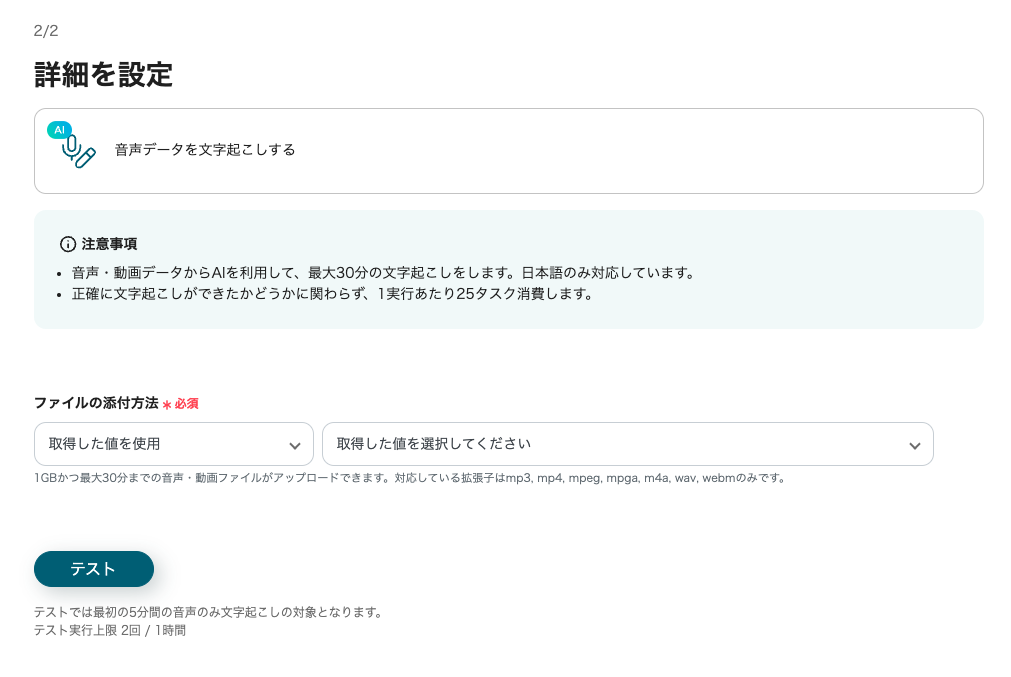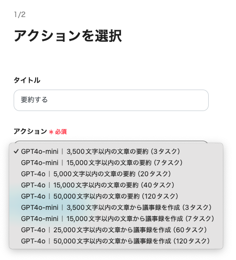 AI機能の「テキストを生成する」アクションでは、プロンプトを編集することで、共有するメッセージの文章を自由にカスタマイズできます。例えば、参加者リストや録画リンクを含めた報告形式の文章などを自動生成できます。 Chatworkの「メッセージを送る」アクションでは、通知を送るルームを任意で指定できます。また、メッセージ本文に固定のテキストを追加したり、前のステップで取得した参加者情報や録画リンクといった動的な情報を組み込んで送信することも可能です。 ■注意事項